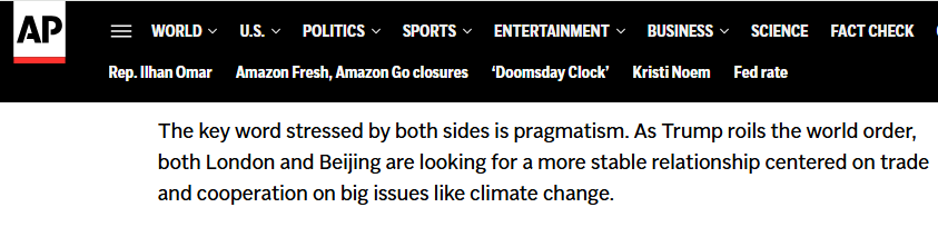 報道說,英中雙方強調的關鍵詞是“務實”。隨著美國攪動世界秩序,倫敦和北京都在尋求一種以貿易和氣候變化等重大問題合作為中心的更穩定關系。