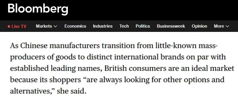 彭博社網站的報道指出,相比美國的貿易保護主義政策,英國對中國貿易持開放態度。報道援引英中貿易協會零售和電子商務部門主管唐賽琳(音譯)的觀點指出,在英國市場,消費者歡迎任何能提供優質產品和物有所值的優秀品牌。她表示,隨著中國制造商從鮮為人知的商品生產者轉型為與國際知名品牌比肩的獨特品牌,英國消費者成為其理想的目標市場,因為當地買家“始終在尋求更多選擇和替代方案”。