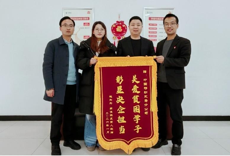 當天,受助學生趙彤彤及親屬等一行4人,借寒假返鄉之際專程來到永壽移動公司,將兩面錦旗送到了公司負責人手中。學生激動地表示:“在我們求學最艱難的時刻,是咸陽移動伸出了援手。這份資助不僅解決了我們入學的經濟難題,更讓我們深切感受到了來自社會的關懷與央企沉甸甸的責任擔當?!?/p>