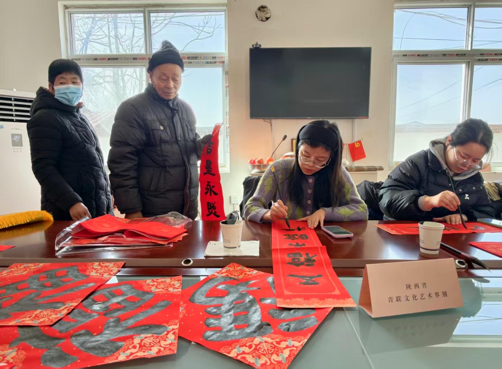 志愿服務項目一:翰墨送福,年味到家——陜西省青年書法家協會、省青聯文化藝術界別、陜西交控咸銅分公司的志愿者現場揮毫,將一副副寓意吉祥的春聯、一張張喜慶的“福”字送到村民手中;