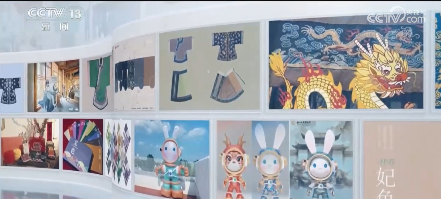 蘇州絲綢博物館館長 錢兆悅:像這一款絲巾的紋樣都來自于數據庫里的那件朱紅色傳統的女服上的這些紋樣。這個是中國探月工程的官方IP兔星星,外面身穿的宇航服上面,就是來自于我們館藏明代的四合如意云紋,云紋和航天、太空有著很密切的關系,也象征著我們中國文化和中國科技的兩種力量融合。