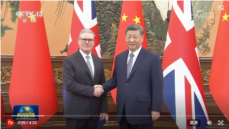 1月29日上午,國家主席習近平在北京人民大會堂會見來華進行正式訪問的英國首相斯塔默。雙方同意中英要發展長期穩定的全面戰略伙伴關系。