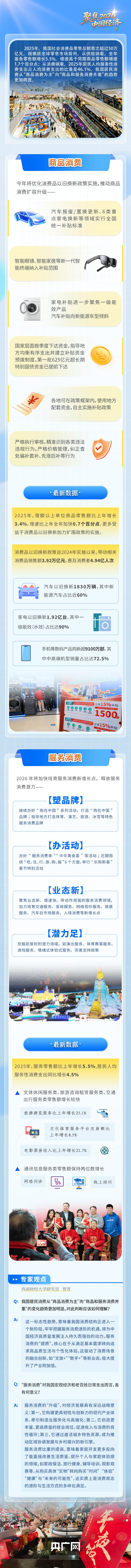 國新辦最新發(fā)布的年度經濟數(shù)據(jù)顯示,2025年我國消費支出對經濟增長的貢獻率超過一半,達到52%。隨著提振消費專項行動落地顯效,包括商品消費和服務消費在內的消費已成為我國經濟增長的主動力和穩(wěn)定錨。2025年的消費數(shù)據(jù)有哪些亮點看點?2026年消費領域有何趨勢導向?央廣網邀請相關專家進行解讀。