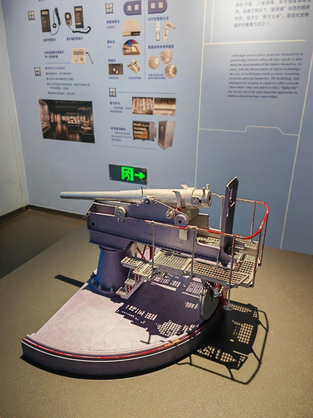 展廳中央的3D打印克虜伯鐵炮模型,便生動詮釋了這一點。這臺模型的誕生,是科技賦能文物修復的鮮活實踐。因館藏克虜伯要塞炮殘缺嚴重,修復團隊輾轉多地博物館尋訪同類型實物,通過實地手動測量,利用軟件進行工業制圖,經建模、模擬復原后,利用現代制作工藝復刻出缺失零部件,最終實現科學修復。