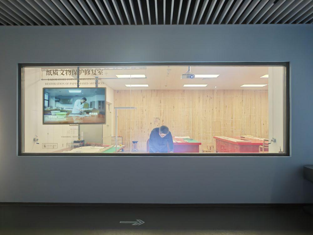 在所有展區中,讓觀眾駐足時間最長的,當屬兩間被透明玻璃窗“框”進展廳的文物保護修復實驗室。窗外,觀眾流連駐足;窗里,修復師手持排筆細細撫平古籍褶皺,或對瓷器釉面進行細致清理。文物修復最為日常的“慢時光”,如現場直播一般呈現在觀眾眼前。