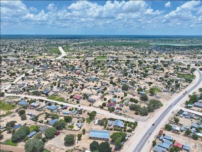 “村村通”項目致力于打通偏遠村莊至城鎮主干道的“最后一公里”。圖為“村村通”項目在納米比亞實施后,倫杜市圖欣吉雷尼村修建了與主干道連通的村道(無人機照片)。