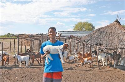 “村村通”項目的實施助力倫杜市姆博拉村畜牧業發展。圖為在姆博拉村,村民卡西安展示自己飼養的小羊。