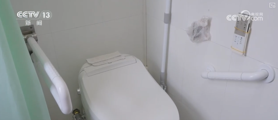 適老化改造設計師魏玲介紹,在每一個空間場景中都為老人設置了一些安全扶手,在馬桶旁區域安裝了一個可以上翻的扶手,不使用的時候可以翻上去,這樣也不會影響到通行。