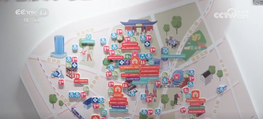 家里有一鍵呼救的“生命線”,小區有老人友好的“導航線”,步行不到15分鐘,街道里還有提供各種養老服務的“生活盒子”,也就是建在社區中的一站式綜合服務空間。在徐家匯街道的“生活盒子”,記者看到一張這樣的養老服務中心地圖,老人可以早上去社區食堂吃飯,中午參加手工活動,下午去看電影,享受“一站式”便利。