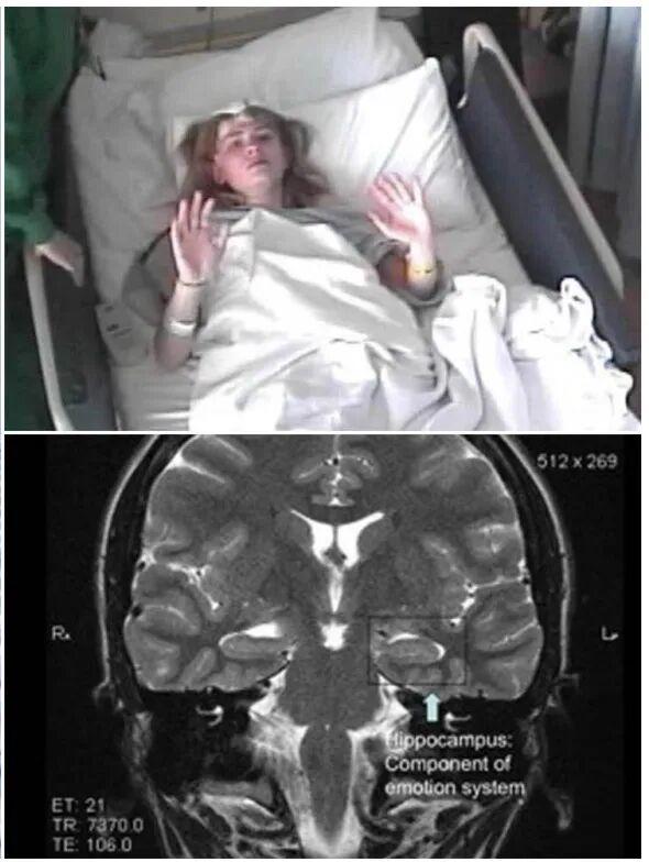 之后,又是一次更嚴重的癲癇發作和住院治療。在醫院時,她會因一時發怒掌摑給她做檢查的護士,并在輸液時拔掉輸液管,尖叫著試圖從醫院逃跑。在住院的兩周時間內,每天都有各類醫生來給她診斷,她幾乎做了所有檢測,但依舊是查不出任何病因。