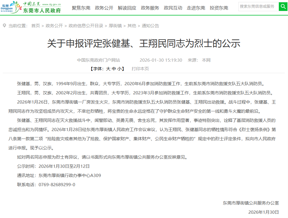2026年1月28日經(jīng)東莞市厚街鎮(zhèn)人民政府工作會議審議,認為王翔民、張健基同志的犧牲情形符合《烈士褒揚條例》第八條第一款第二項“搶險救災或者其他為了搶救、保護國家財產(chǎn)、集體財產(chǎn)、公民生命財產(chǎn)犧牲的”規(guī)定中的烈士評定條件,擬向市人民政府進行申報。