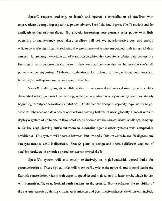美國聯邦通信委員會(FCC)的一份新文件顯示,SpaceX正在申請發射并運營一個由至多100萬顆衛星組成的星座,這些衛星具備前所未有的計算能力(軌道數據中心),以支持先進的人工智能。