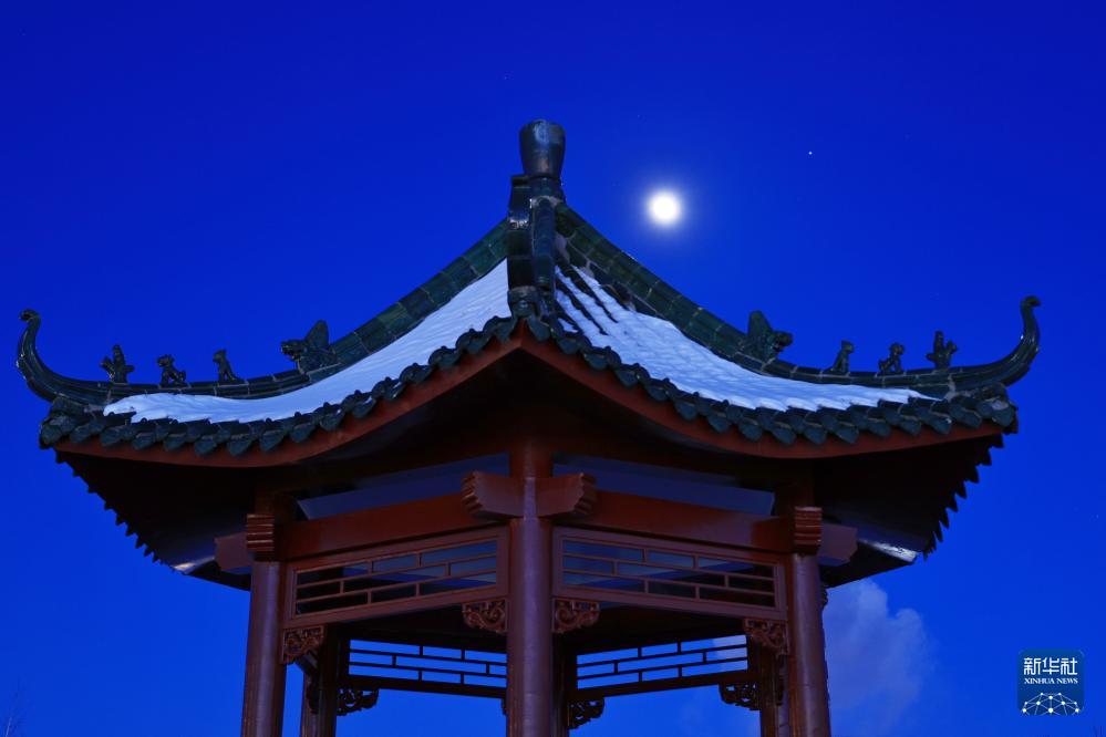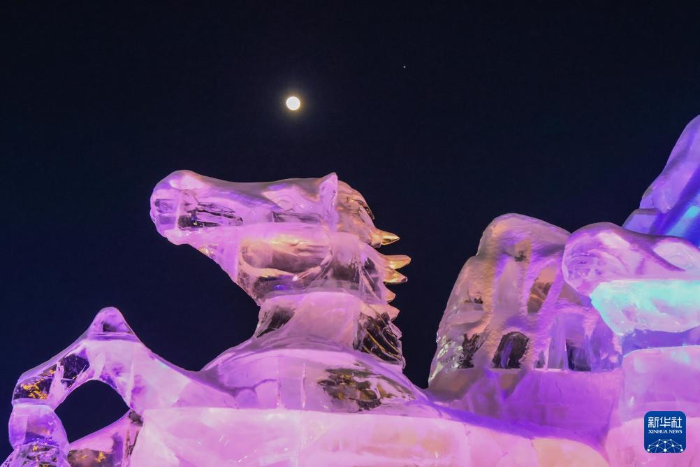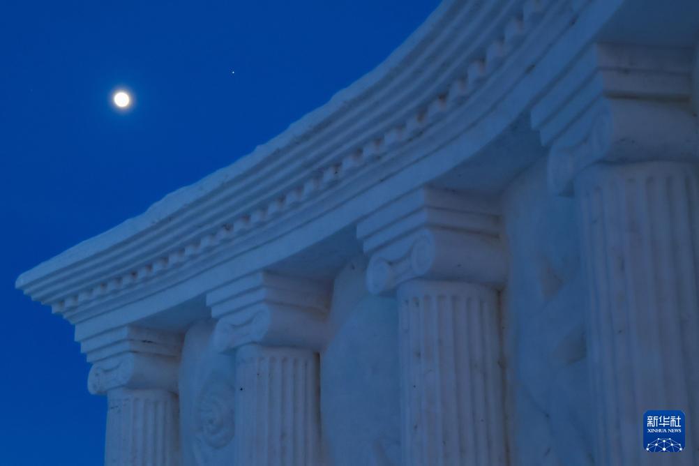 1月31日,在黑龍江省嘉蔭縣,冰雕與木星伴凸月相映成趣。