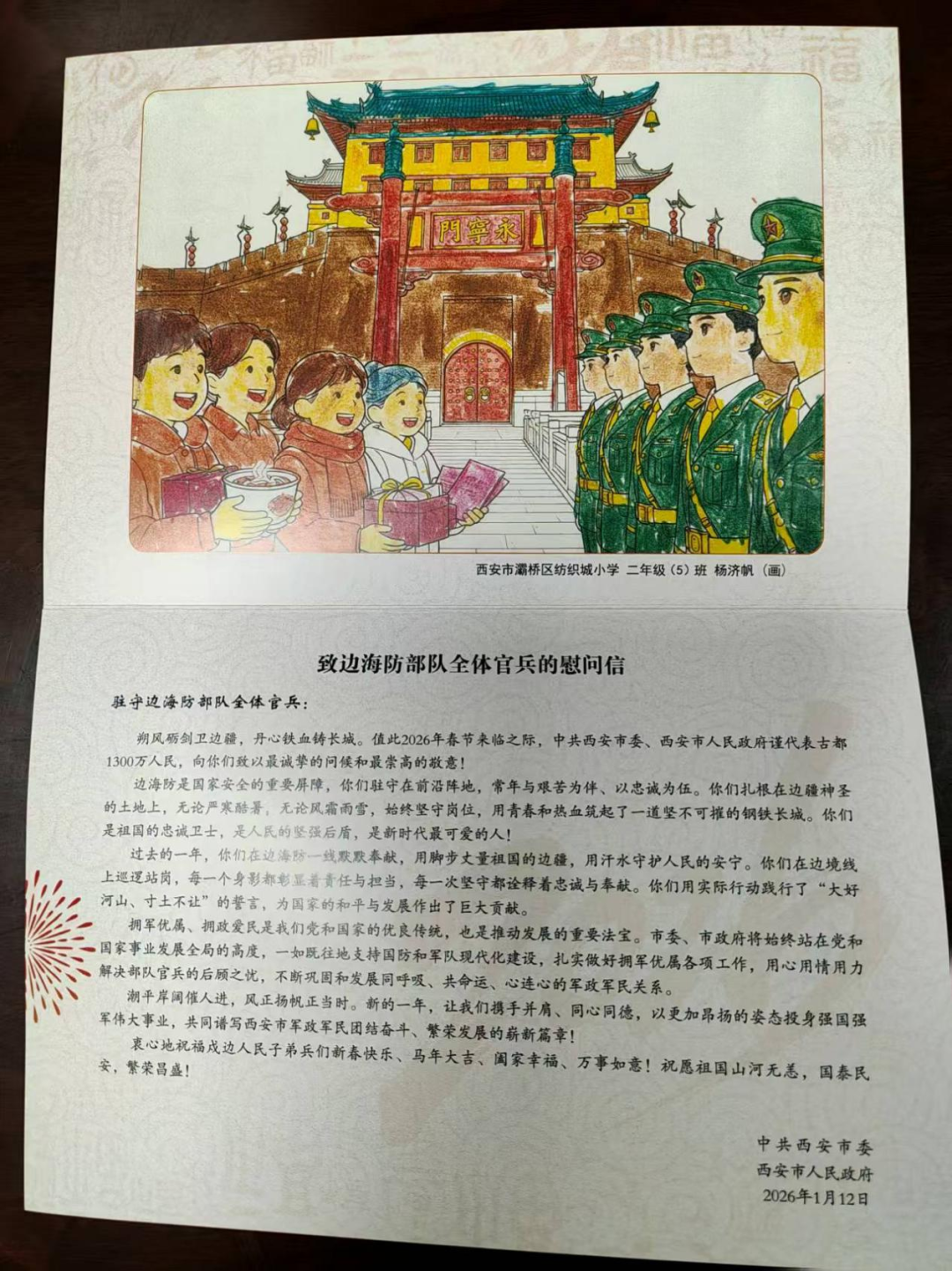 慰問信中,中共西安市委、西安市政府向全體戍邊官兵致以節日的祝賀與崇高的敬意,字里行間飽含對官兵們“頂風雪、守邊疆、護安寧”的由衷贊嘆。樸實真摯的話語傳遞著地方黨委政府與全省人民對戍邊衛士的深厚情誼。新年賀卡則以“福送馬駿”為主題,精心挑選了以在永寧門前西安市民給部隊官兵送上各種慰問品的場景為主題的西安市小學生手工畫作為賀卡圖片,展現了軍民一家親的濃厚氛圍,設計融入鐘樓和西安文化元素,兼具觀賞性與紀念意義。