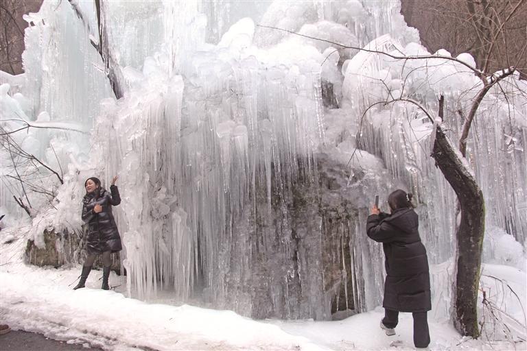 在陜西太白山國家森林公園,雪后的蓮花峰瀑布凝結成壯觀的冰掛。冰柱、冰幔層層疊疊,在陽光照射下愈發晶瑩剔透,引得游客紛紛駐足拍照。