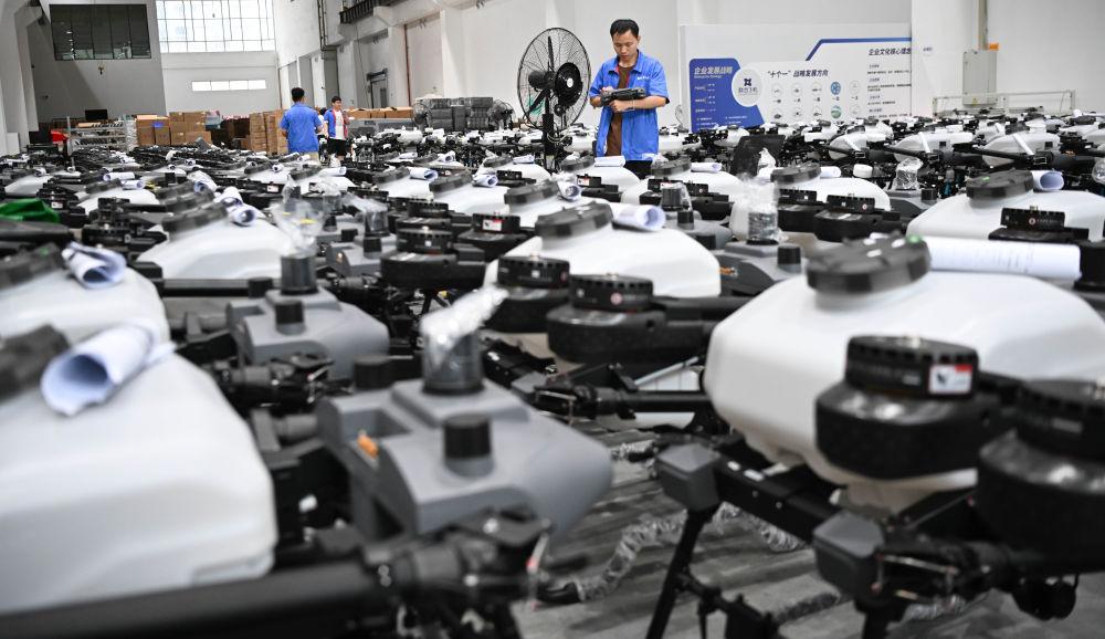 2025年6月26日,工作人員在聯合飛機集團深圳基地植保無人機倉庫內巡視。新華社記者 鄧華 攝