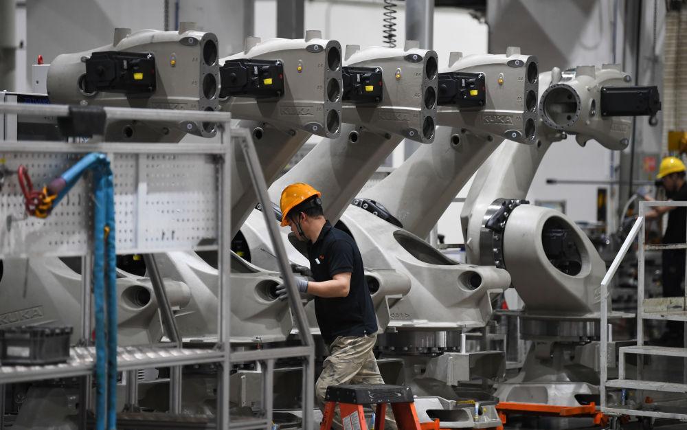 2025年3月25日在廣東佛山市美的庫卡智能制造科技園拍攝的工業機器人產線車間。新華社記者 鄧華 攝