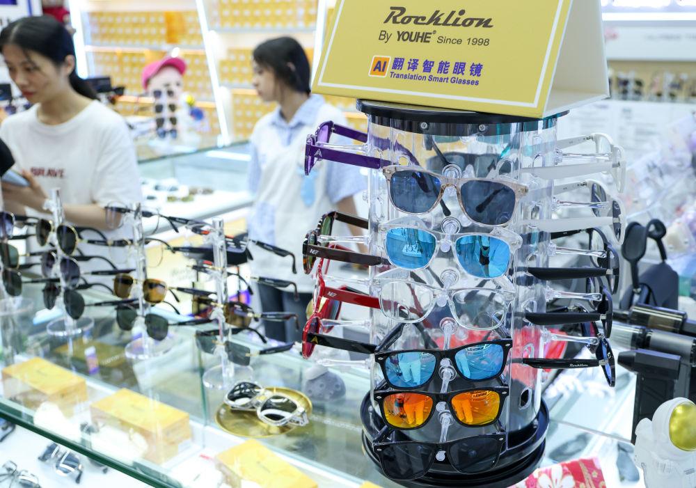 2025年7月22日,深圳華強北一家商戶的柜臺上擺放著不同款式的智能眼鏡。新華社記者 毛思倩 攝