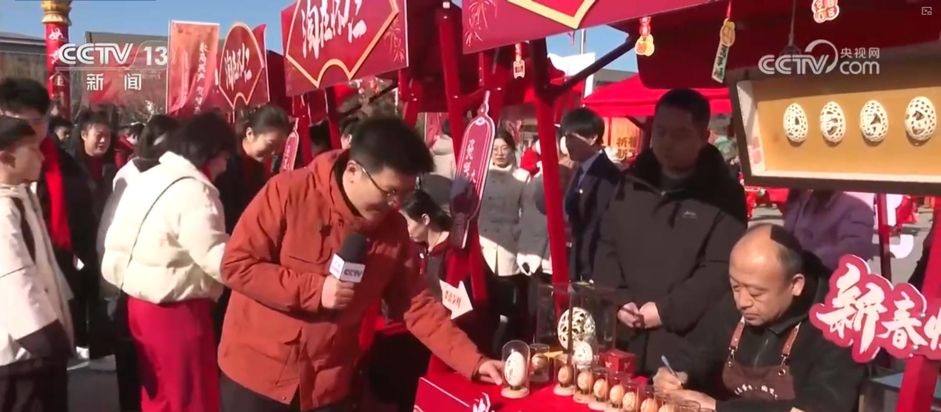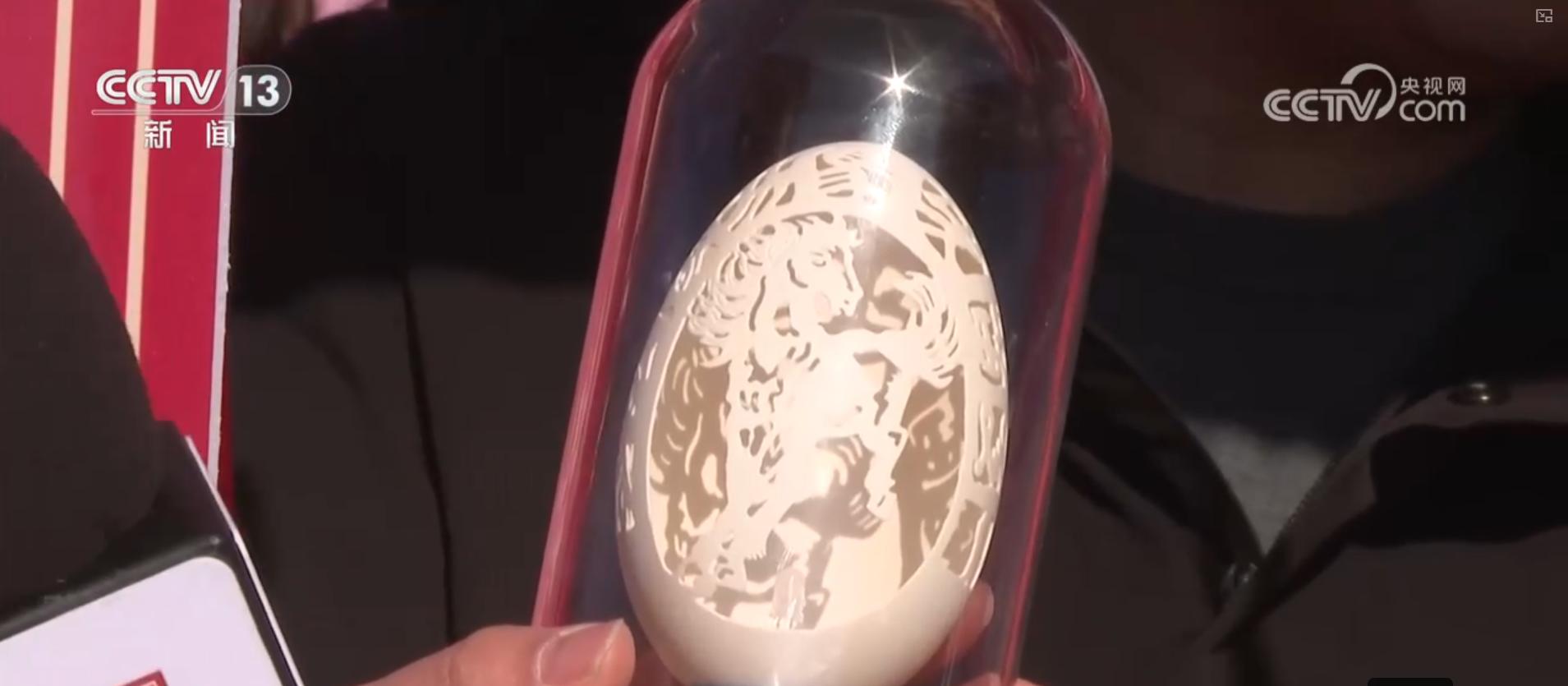 看完表演,再來逛逛好玩的展銷區(qū)。這里的年貨種類豐富,特色鮮明。首先是懷仁陶瓷展區(qū),懷仁陶瓷主要是日用瓷具,也就是日常使用的勺、碗、盤、碟等,此外還有精致美觀的陶瓷擺件。旁邊這個展臺是蛋雕,手藝人在薄薄的雞蛋殼上精雕細琢,特別考驗手藝人的功底,力度輕重、明暗層次都要拿捏精準。