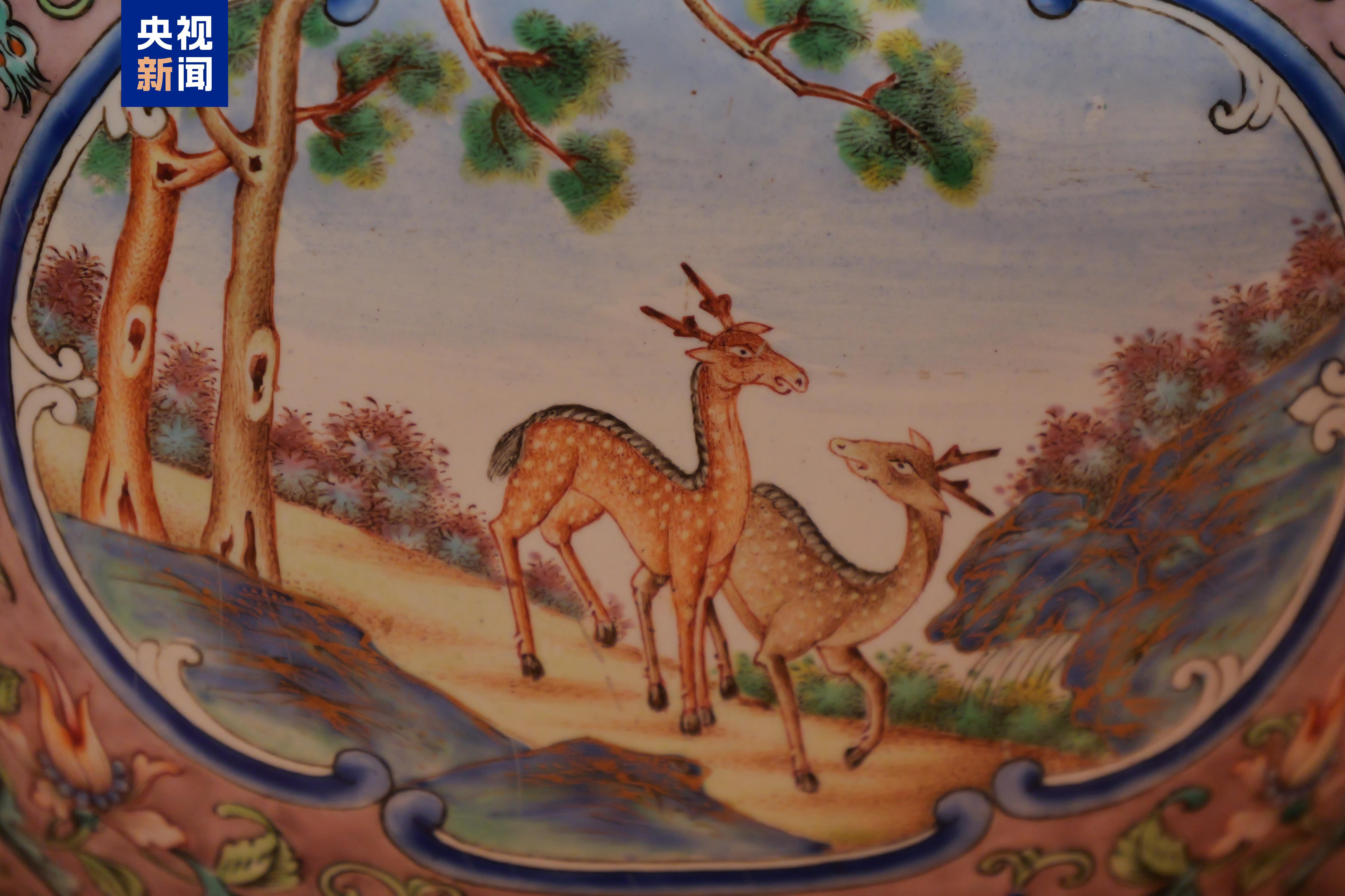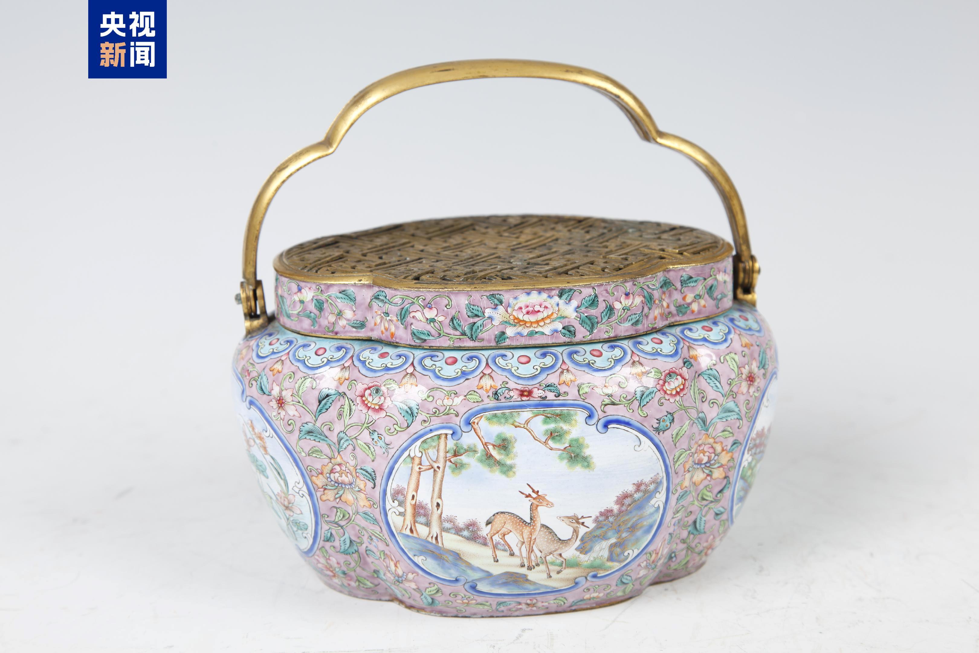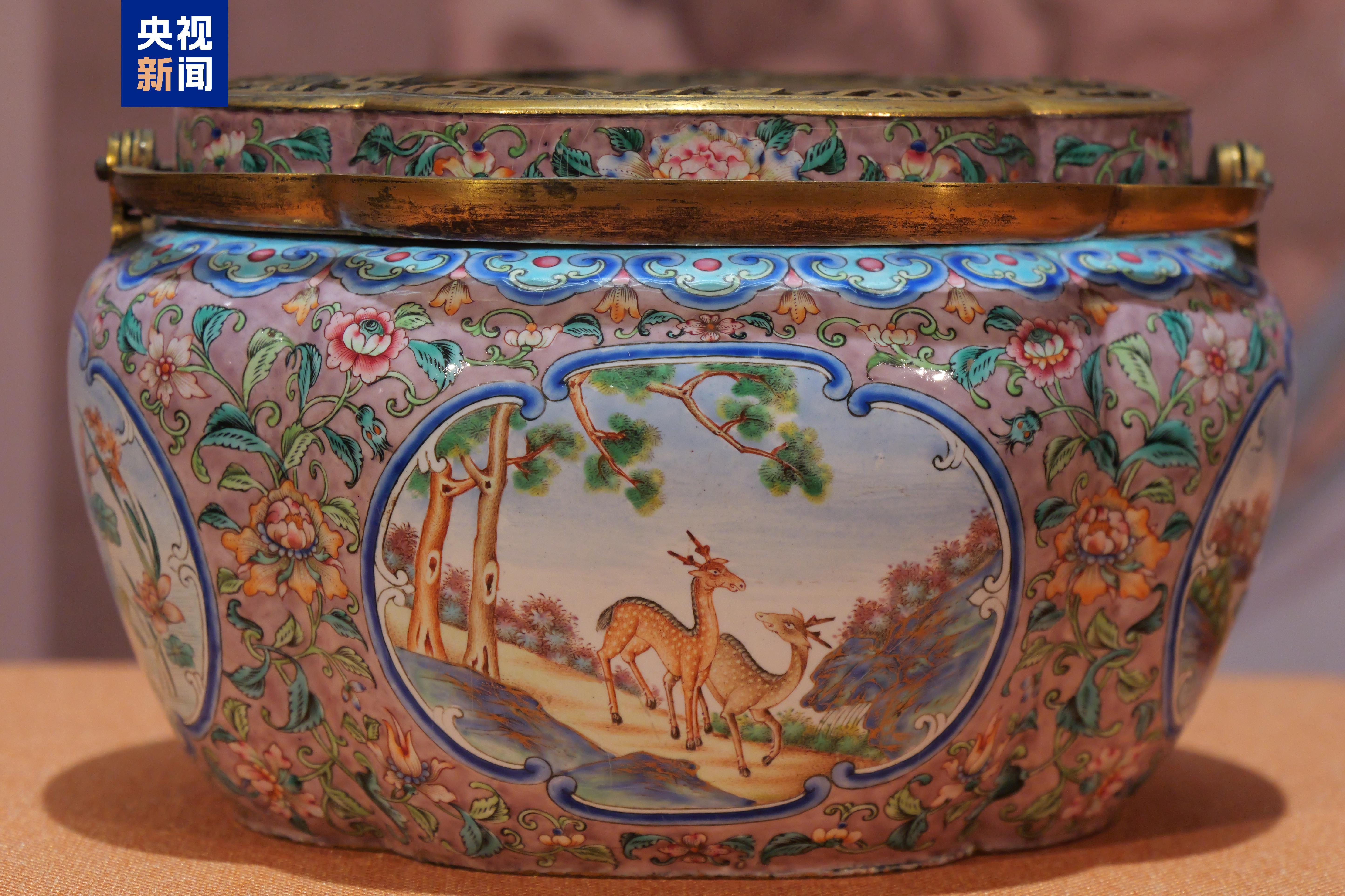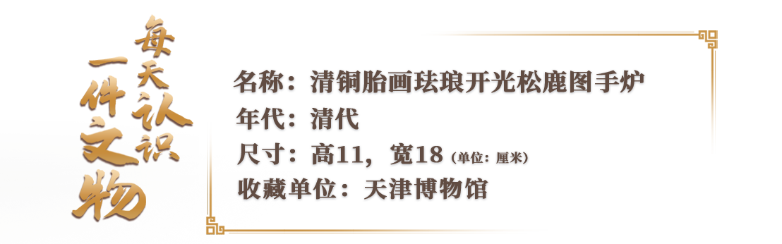 這件清銅胎畫琺瑯開光松鹿圖手爐