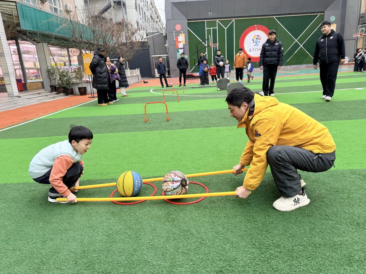 個人技巧挑戰(zhàn)賽在個人技巧挑戰(zhàn)賽中,孩子們化身籃球小將,用行進間Z字型折返運球展現(xiàn)扎實球感,在“小貓釣魚”游戲里鍛煉敏捷反應(yīng),每一次加速、每一次變向都引得場邊家長陣陣喝彩。而親子全明星賽則將氛圍推向高潮。“大猩猩夾球接力賽”里,家長與孩子默契配合,用雙臂夾著籃球大步奔跑;“運球跳圈接力賽”中,大手牽小手穩(wěn)步前行;“大象轉(zhuǎn)圈1分鐘投籃賽”里,轉(zhuǎn)得暈頭轉(zhuǎn)向卻依然堅持投籃的模樣,惹得全場笑聲不斷;“搬運工游戲”更是讓親子在協(xié)作中拉近了距離。