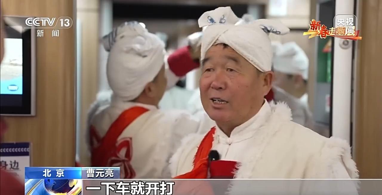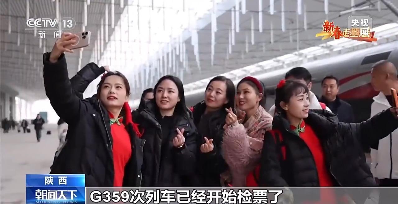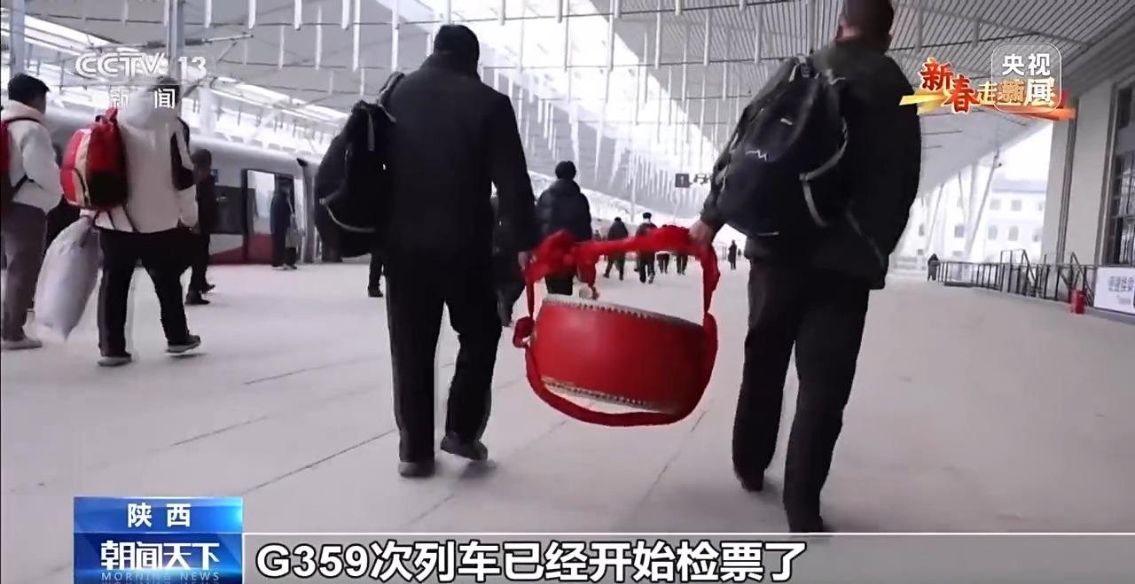 總臺央視記者 鄭連凱:現在的時間1月26日早上7點30分,延安的天剛蒙蒙亮,腰鼓隊隊員已經趕到延安站,稍后他們要搭乘延安開往北京的G359次首發列車。