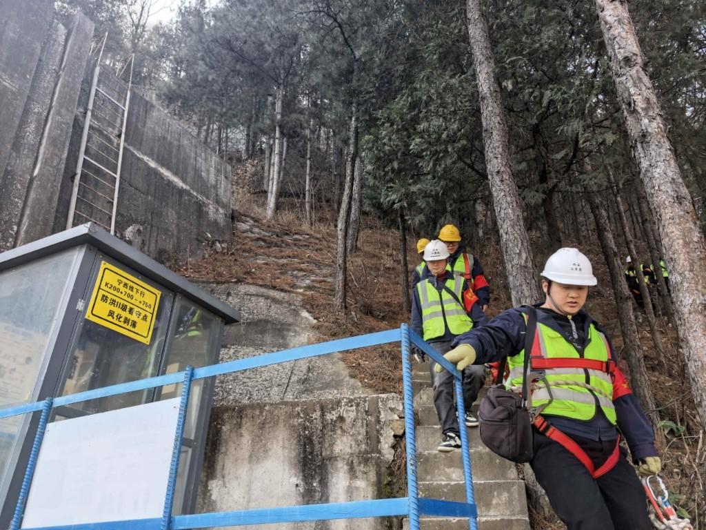 8時50分左右,商洛檢查組與鐵峪鋪檢查組的人員匯合。工長冀拓叮囑安全事項,協助其他隊員穿戴好安全帶、安全帽,隨后全體人員攜帶著檢查錘、砍刀、鐮刀、扳手等工具,冒著凜冽的寒風,依次登上位于西側橋下的封閉網門。