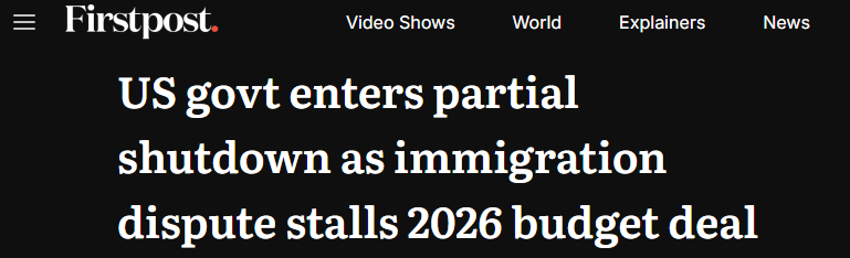 這是自去年11月12日結束的美國歷史上最長聯邦政府“停擺”(持續43天)以來,政府再度陷入部分“停擺”。雖然預計此次“停擺”時間將大幅縮短,但若無法迅速解決,部分聯邦雇員或將無薪工作,其余人員則可能被迫無薪休假。福克斯新聞首席國會記者查德·珀格拉姆表示:“此次‘停擺’預計至少將延長至近90小時——前提是眾議院能在2月2日與參議院達成一致。”
