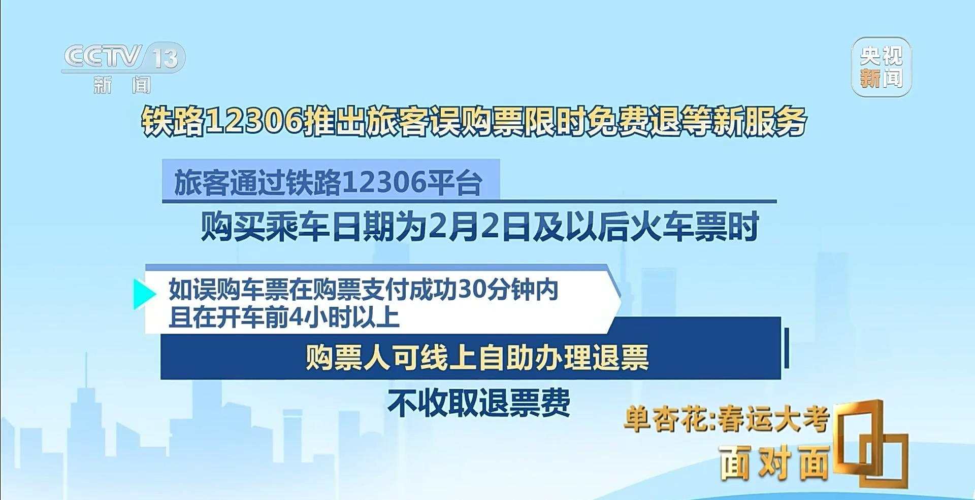 為了進一步提升旅客的購票體驗,從1月19日開始,12306平臺推出旅客誤購限時免費退票的服務,旅客通過鐵路12306平臺購買乘車日期為2月2日及以后火車票時,如誤購車票在購票支付成功30分鐘內,且在開車前4小時以上,購票人可線上自助辦理退票,不再收取退票費用。