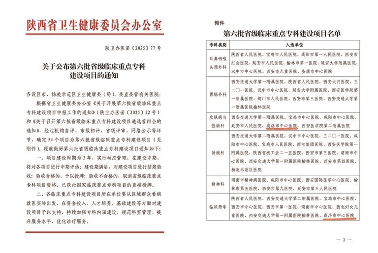 皮膚科、臨床藥學入選省級重點專科培育項目,麻醉科、婦科順利通過省級重點專科終期驗收,現有省級臨床重點專科(含建設項目)共12個。卒中中心獲評“陜西省三級卒中中心”,產前診斷技術服務獲省級批準落地。組建生殖醫(yī)學科、中西醫(yī)結合骨科、兒童保健科,重癥醫(yī)學科、骨科獲評市級重點專科,學科體系更趨完善,核心診療能力顯著增強。
