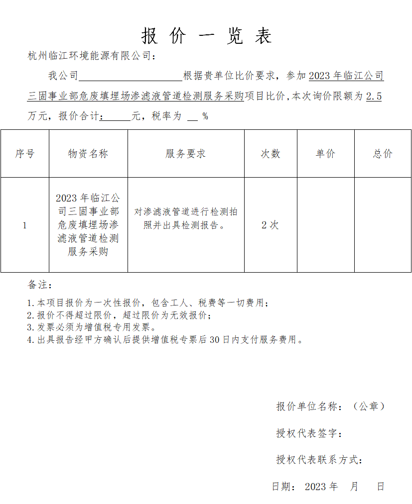 根據(jù)《危險(xiǎn)廢物填埋污染控制標(biāo)準(zhǔn)2019》第10.5條企業(yè)應(yīng)對滲濾滴導(dǎo)排管道要進(jìn)行定期檢測和清淤,三固事業(yè)部需要委托第三方服務(wù)機(jī)構(gòu)對滲濾液管道進(jìn)行檢測,并出具檢測報(bào)告,歡迎符合要求的供應(yīng)商積極參與。
